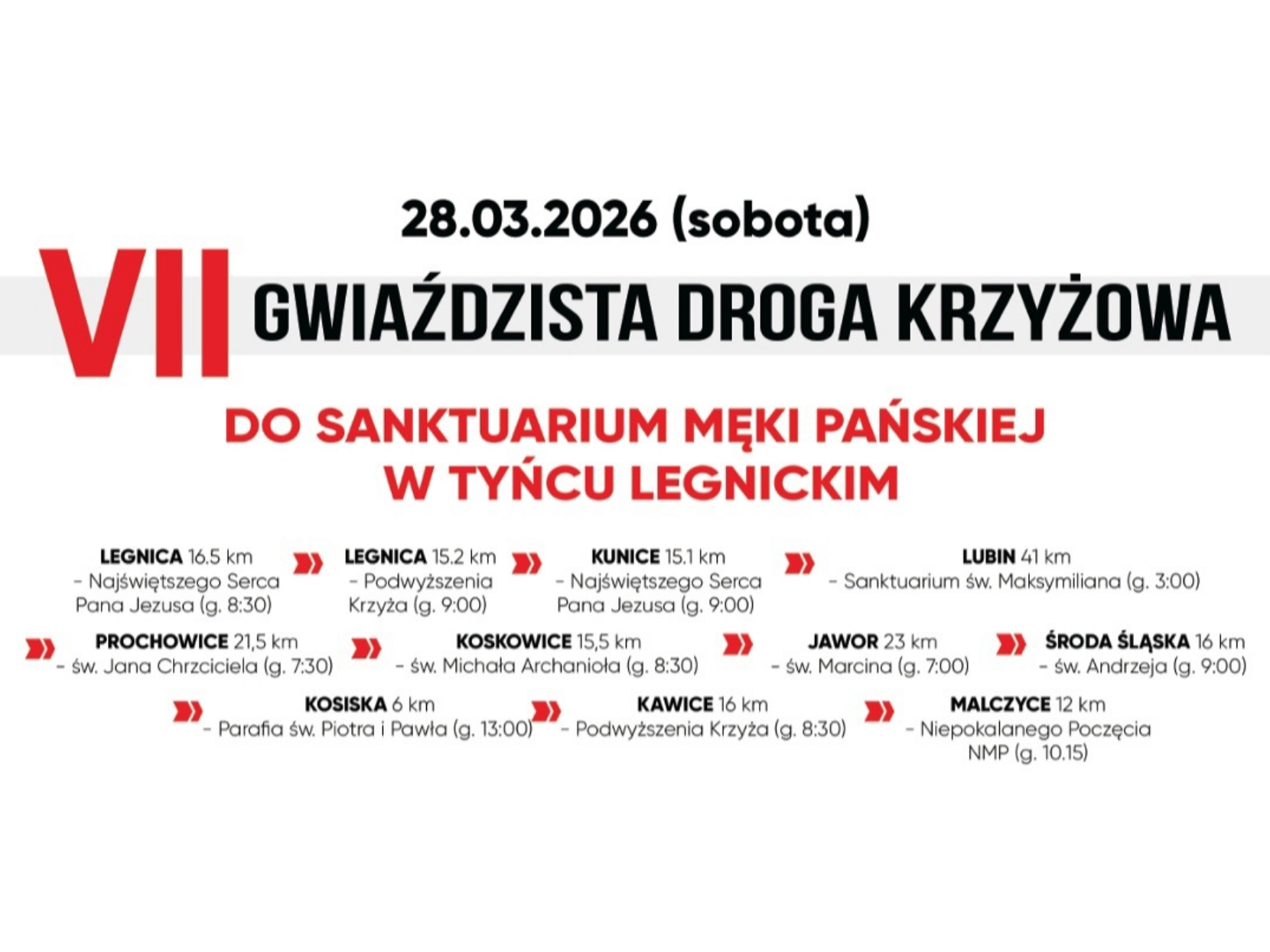 W sobotę 28 marca 2026 r. zapraszamy do udziału w VII Gwiaździstej Drodze Krzyżowej, która poprowadzi nas do Sanktuarium Męki Pańskiej w Tyńcu Legnickim.To wyjątkowe wydarzenie wielkopostne gromadzi wiernych z różnych parafii naszego regionu, którzy wyruszają z wielu miejsc, by wspólnie spotkać się u stóp Krzyża. Każda z tras ma swój charakter i długość –