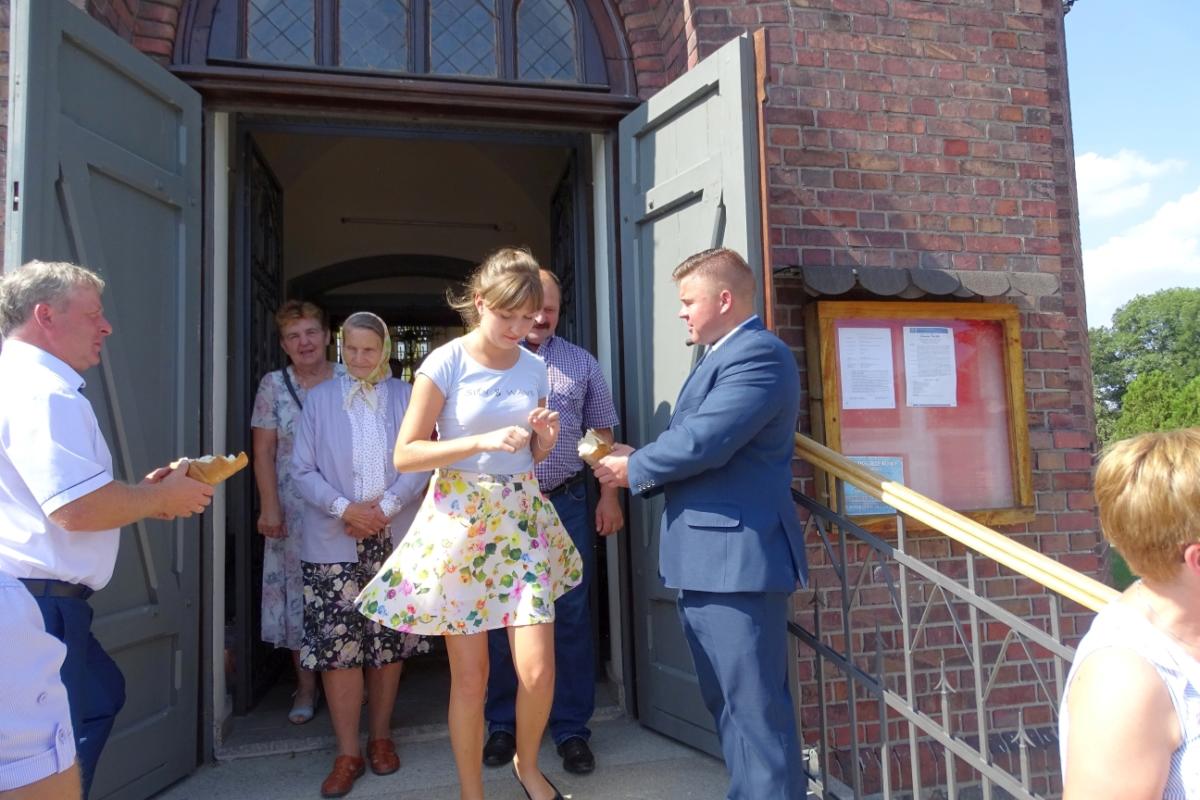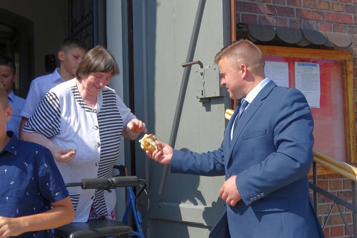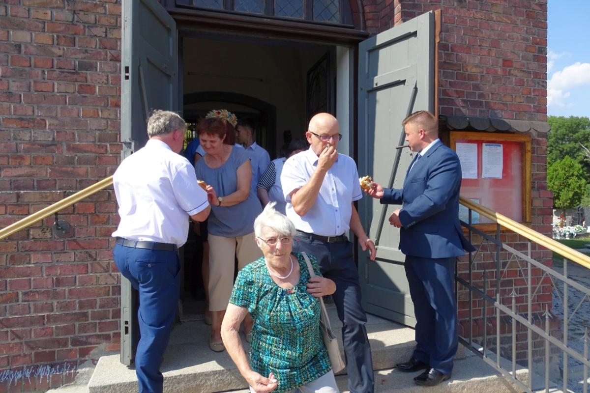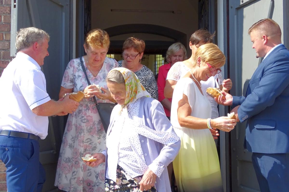 Podczas Mszy św. przedstawiciele rolników wręczyli Kapłanowi oraz Wójtowi Gminy Pawłowi Gregorczukowi tradycyjne bochny chleba, które są składane jako wotum wdzięczności dobremu Panu Bogu za tegoroczne plony. W homilii mogliśmy usłyszeć słowa dziękczynienia Bogu za to, że mamy chleb powszedni, Matce Bożej za całe dobro, jakie czyni w naszym życiu, rolnikom, którzy pracują w „pocie czoła”, Matce Ziemi za to, że nas żywi oraz Chrystusowi, który w darze Eucharystii w tej małej kruszynie chleba ofiaruje ludziom siebie samego w najczystszej synowskiej miłości. Po Mszy św. wszyscy uczestnicy podzielili się upieczonym chlebem w geście braterskiej solidarności.