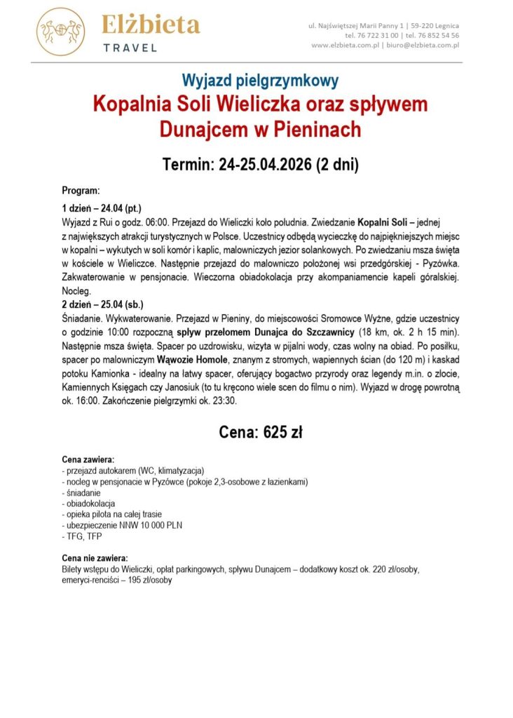 - Będzie organizowany wyjazd do Wieliczki, na Podhale i w Pieniny z góralską kapelą podczas kolacji „U Zosi” w Pyzówce w dniach: 24-25 kwietnia. Szczegóły są podane na plakacie. Przy zapisie proszę o uiszczenie zaliczki 200 zł od osoby. Koszt wyjazdu 625 zł od osoby + bilety wstępu. Zapraszamy do wzięcia udziału. Jest już komplet osób. Zapisujemy chętne osoby na tzw. rezerwę.