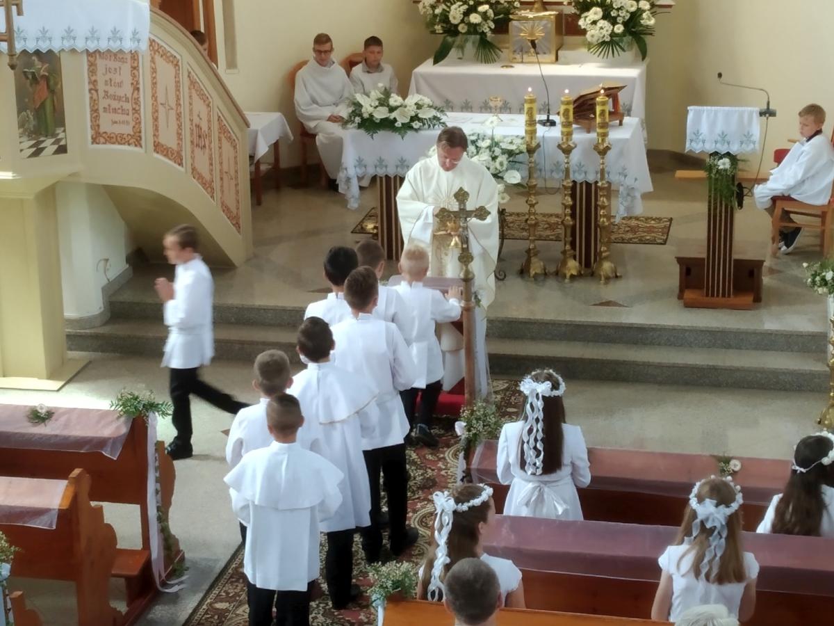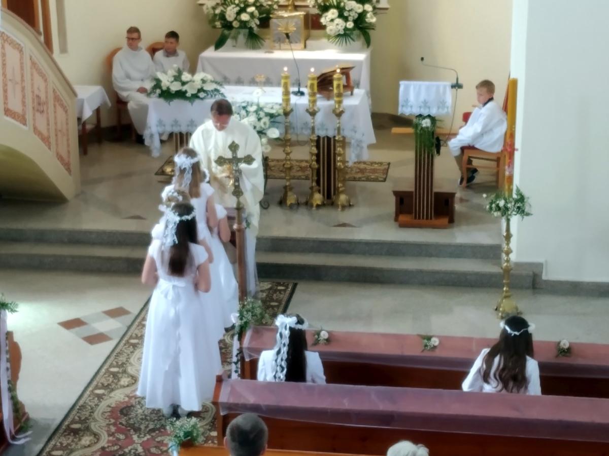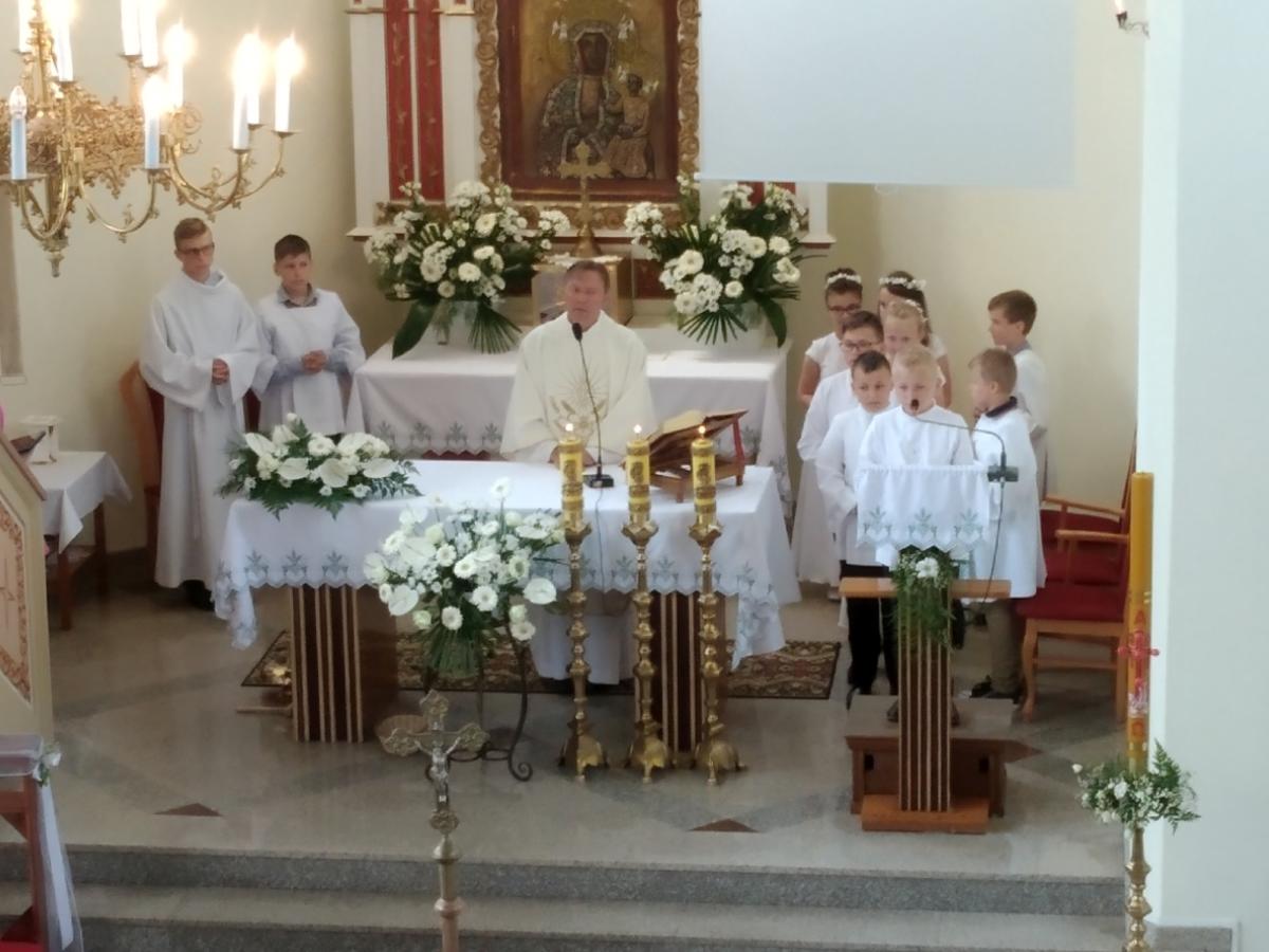 Na Mszy Świętej, którą poprowadził ks. proboszcz Wiesław, dzieci z radością wspominały dzień, kiedy to po raz pierwszy Pan Jezus w postaci Chleba zagościł w ich sercach. W słowie skierowanym do dzieci i dorosłych ksiądz proboszcz podkreślił, aby w całym swoim życiu troszczyć się o czystość serca oraz zwrócił uwagę jak ważne jest okazywanie wdzięczności i szacunku rodzicom.