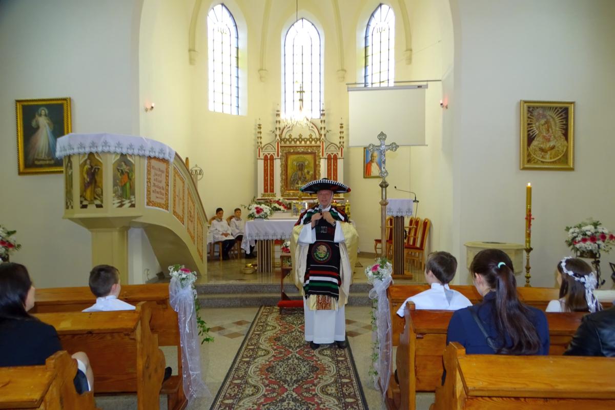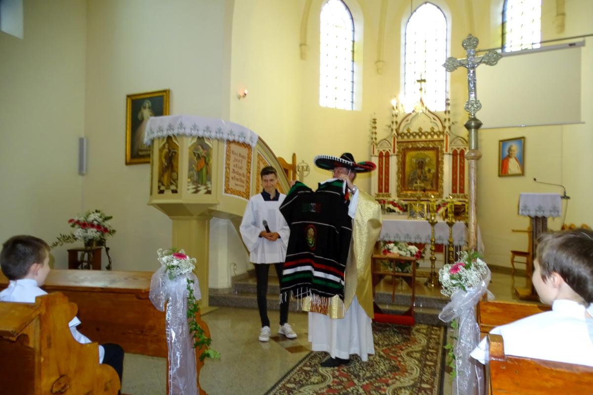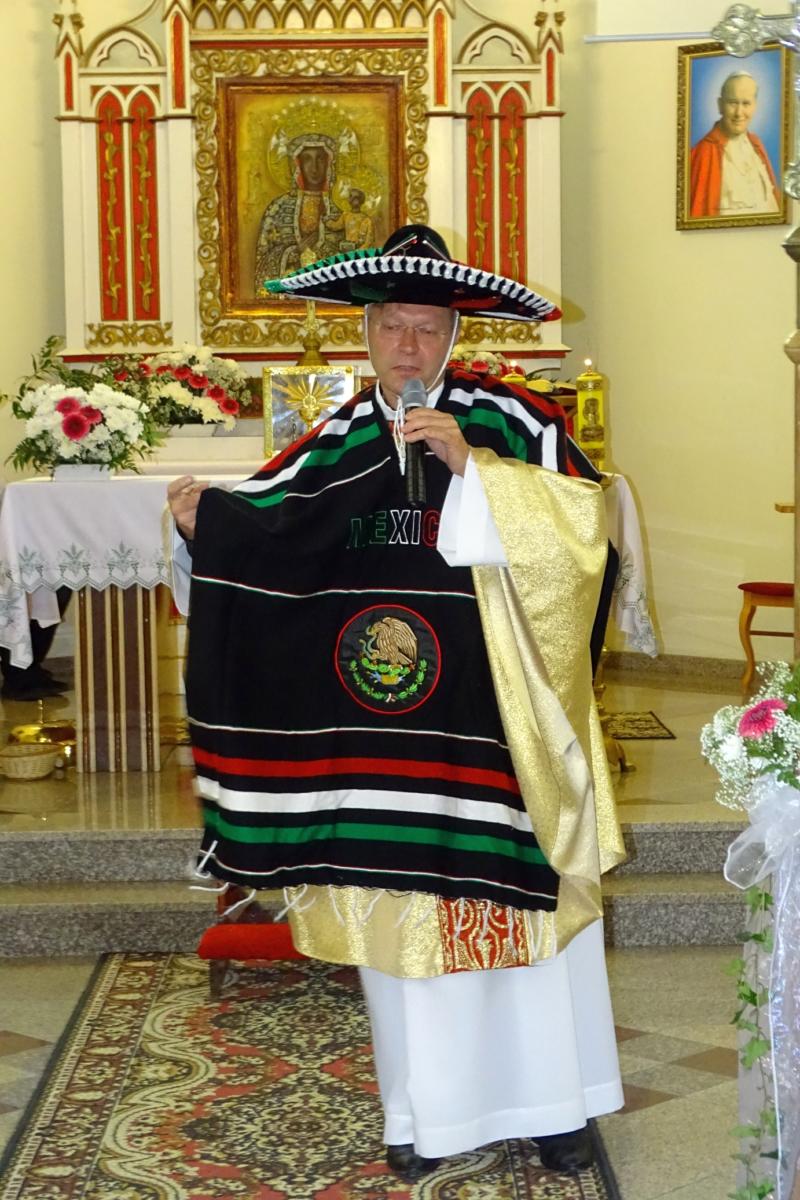 Ks. Proboszcz Wiesław Złotek nawiązał w homilii do Ewangelii wg św. Jana o „Dobrym Pasterzu”. Przygotował również niespodziankę, strój pasterza meksykańskiego. Sombrero zostało przedstawione jako Kościół, który daje dach nad głową, i zapewnia bezpieczeństwo swoim owieczkom. Ponczo oznaczało łaskę uświęcającą, w którą człowiek się przyodziewa, gdy żyje bez grzechu. Jest to pancerz, który nas chroni. Laska pasterska miała oznaczać przykazania Boże, którymi Pan Bóg nakierowuje nas na właściwą drogę, gdy się zagubimy.
